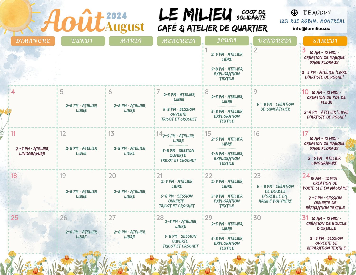Consultez notre calendrier pour découvrir quels ateliers, animés par des artistes de notre communauté, auront lieu prochainement à la coop Le Milieu !