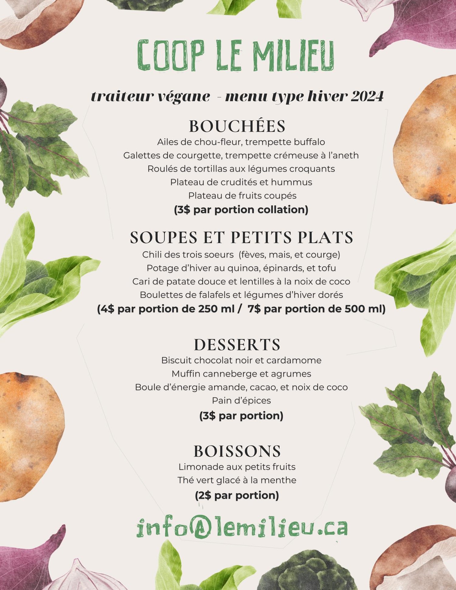 Frais de livraison de 20$ (taux fixe), dans un rayon de 20 km de la Coop Le Milieu.